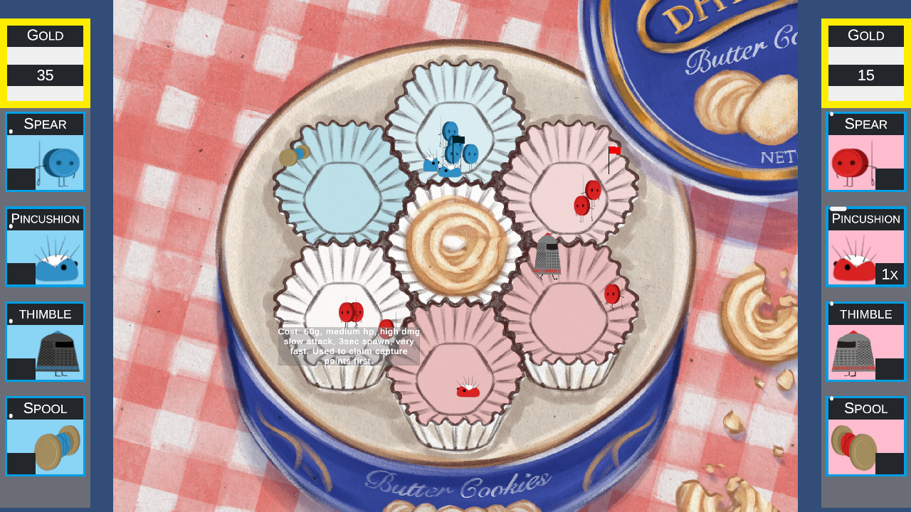 Thimbles: Tanking/denial. Takes a while to kill so prevents enemy caps . Still deals a moderate amount of damage, but is stunned more when outnumbered by smaller units. Fast spawn, slow moving. Best used on your side of the map to prevent flanking